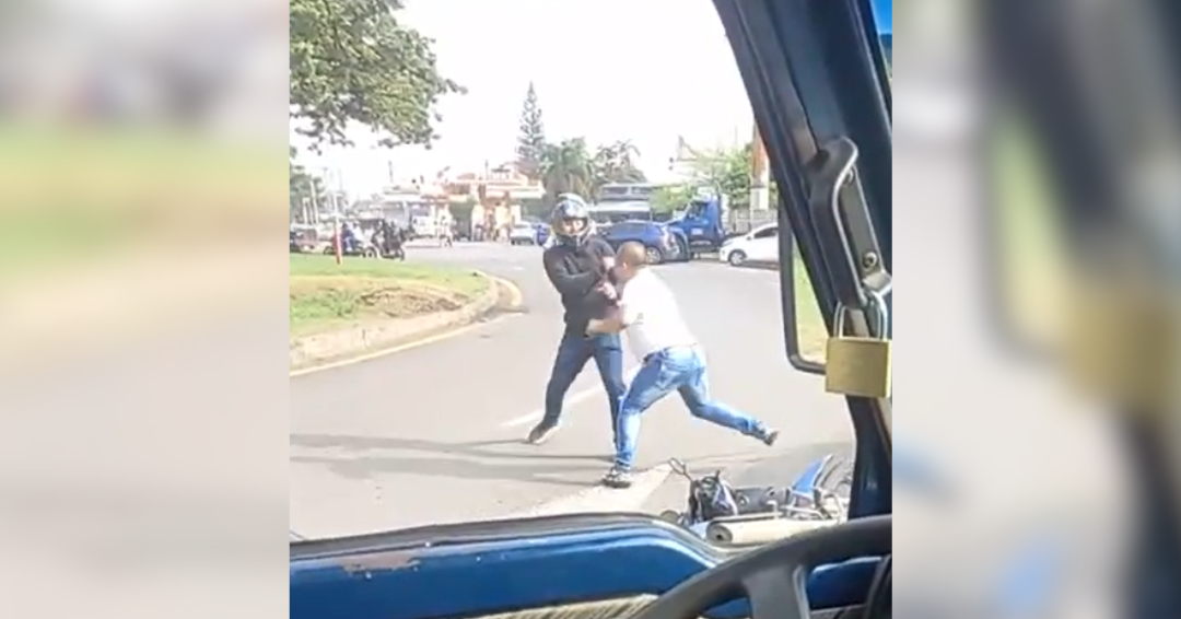 Allí se observa al conductor de un vehículo particular que se enfrenta a puños y patadas con un motociclista.