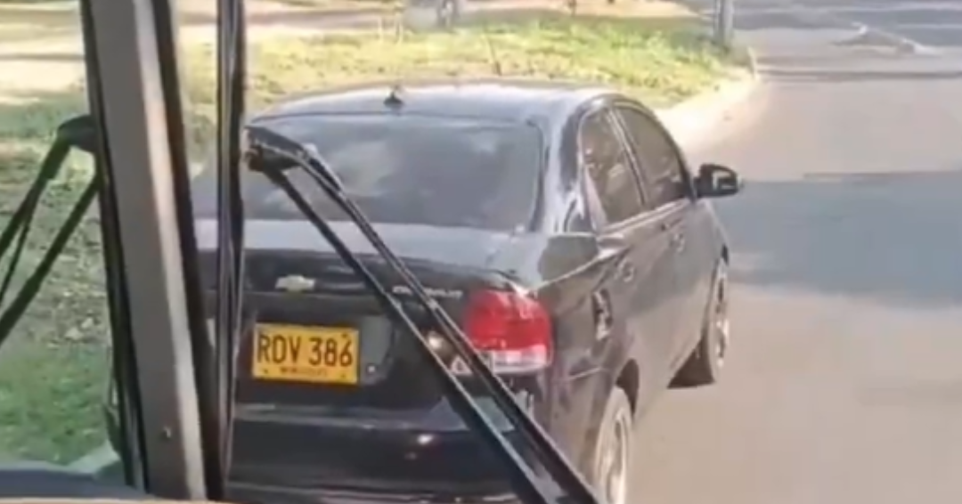 Pues en el video se observa que un vehículo particular de color negro está estacionado en pleno carril, impidiendo el paso del bus del sistema de transporte.
