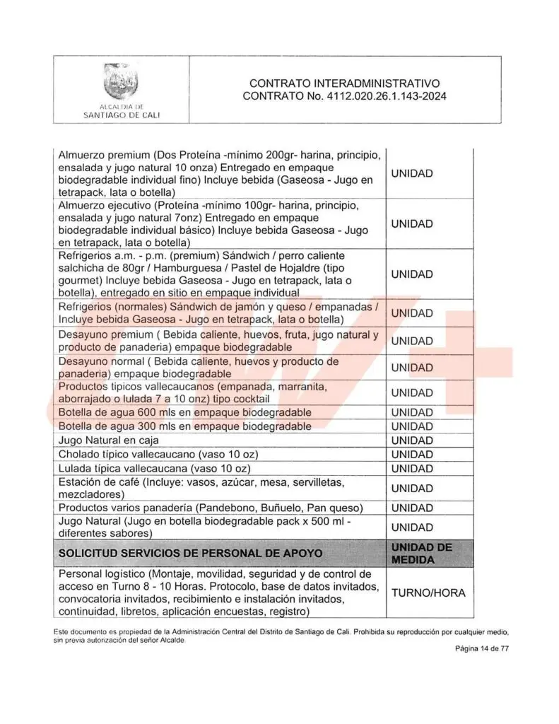 El documento suscrito surge en la Secretaría de Gobierno, a cargo de Andrés Felipe Stapper, quien firma en nombre del gobierno municipal, para apoyo logístico donde el contratista también se obliga a entregar desayunos, almuerzos, comidas; del mismo modo facilitar sillas, tablones, sonidos, carpas, pantallas de video, micrófonos, baños, computadores y otros, los cuales deben ser subcontratados por Canal 13 en su calidad de operador. Ver contrato