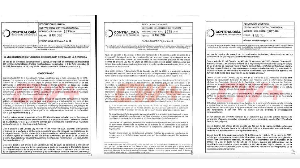 La Contraloría General de la República ha emitido la resolución ORD-80112-1675-2024 el 6 de mayo de 2024, autorizando una intervención funcional de oficio en la Alcaldía de Santiago de Cali y sus entidades descentralizadas.