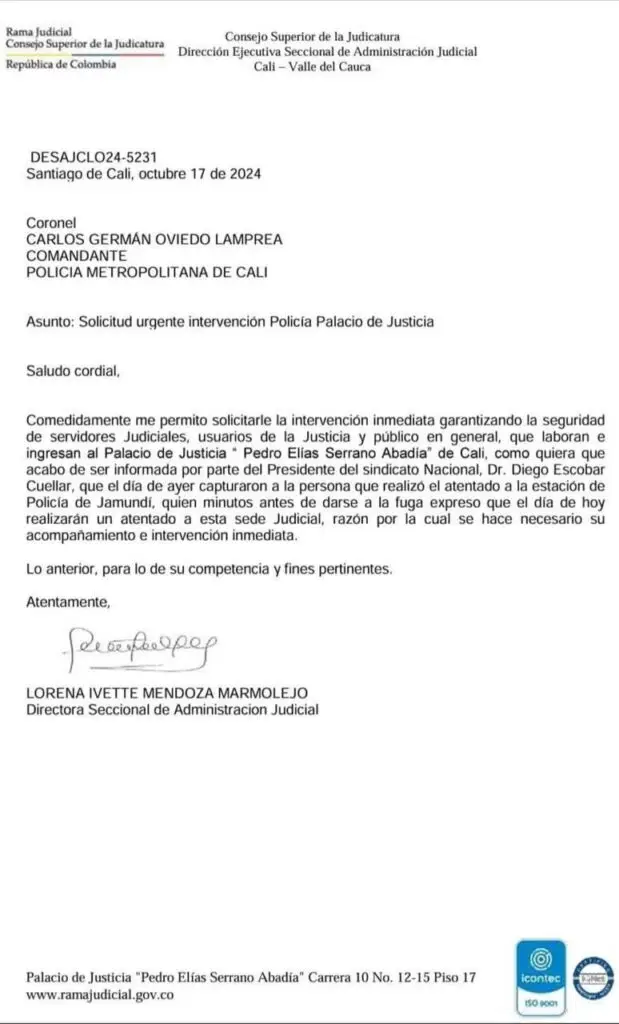 En un comunicado dirigido al coronel Carlos Germán Oviedo Lamprea, comandante de la Policía Metropolitana de Cali, la directora seccional de Administración Judicial, Lorena Ivette Mendoza Marmolejo, solicitó la intervención inmediata de la fuerza pública. Esto para proteger a los servidores judiciales y al público que frecuenta las instalaciones. La alerta fue recibida a través del presidente del sindicato judicial, Diego Escobar Cuéllar, quien informó sobre la amenaza emitida por el sospechoso durante su breve fuga.
