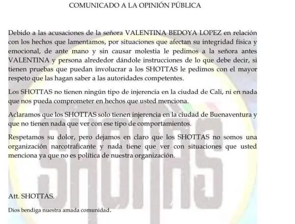 Ante los fuertes señalamientos de Valentina Bedoya sindicando a la organización criminal, Los Shottas, de ser los autores de los asesinatos de su familia, y de estar relacionados a la banda los pescaditos, su vocero en la mesa de dialogo instalada en Buenaventura, ‘Jerónimo’, habló para el medio Telepacífico.