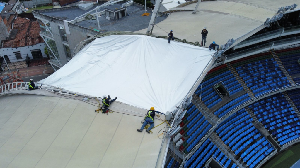 El trabajo de instalación de la lona, que se distribuyó en cuatro días, fue ejecutado por personal certificado en alturas, siguiendo los procedimientos de termosellado y asegurando que la lona quedara perfectamente anclada a la estructura de la tribuna. Este proceso técnico fue clave para garantizar que la nueva lona no solo cumpliera con los estándares estéticos, sino también con los de seguridad.