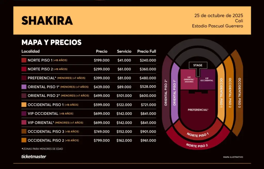 Los precios para ver a la estrella del pop latino van desde los $240.000 hasta los $961.000 en localidades regulares. Además, se han anunciado paquetes VIP que incluyen experiencias premium como accesos exclusivos, mercancía oficial y zonas lounge, con valores que oscilan entre $1.605.700 y $2.874.700.