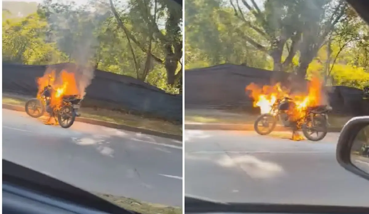 Fue en ese instante cuando, en un acto desesperado, el hombre decidió rociar gasolina y encender su moto en plena vía, generando caos y asombro entre los presentes.