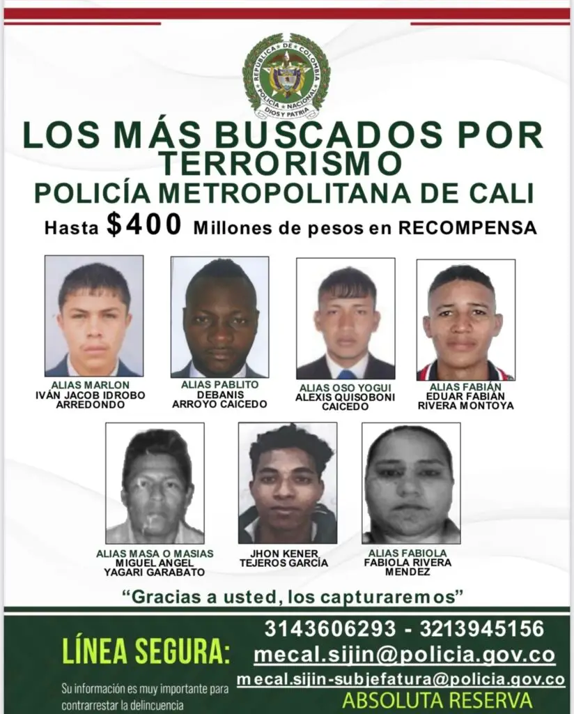 La Policía Metropolitana de Cali publicó una lista de los “más buscados” por terrorismo, ofreciendo hasta 400 millones de pesos por información que lleve a su captura. La nómina incluye alias, nombres completos y datos de contacto para denunciar con absoluta reserva. Esta medida busca cortar redes y llevar a los responsables ante la justicia.