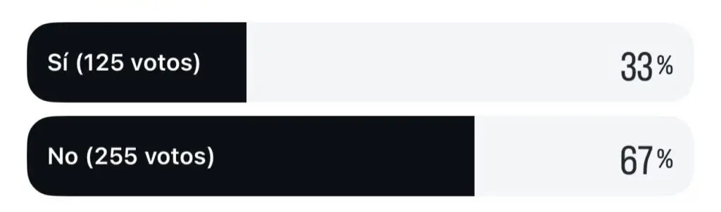 En Instagram, los resultados se movieron en una línea similar. De los 380 votos recibidos, 255 personas (67%) rechazaron la propuesta, mientras que 125 (33%) se mostraron a favor.