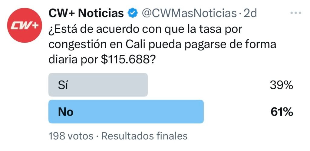 CW+ realizó un sondeo en sus redes sociales con la pregunta: “¿Está de acuerdo con que la tasa por congestión en Cali pueda pagarse de forma diaria por $115.688?”.