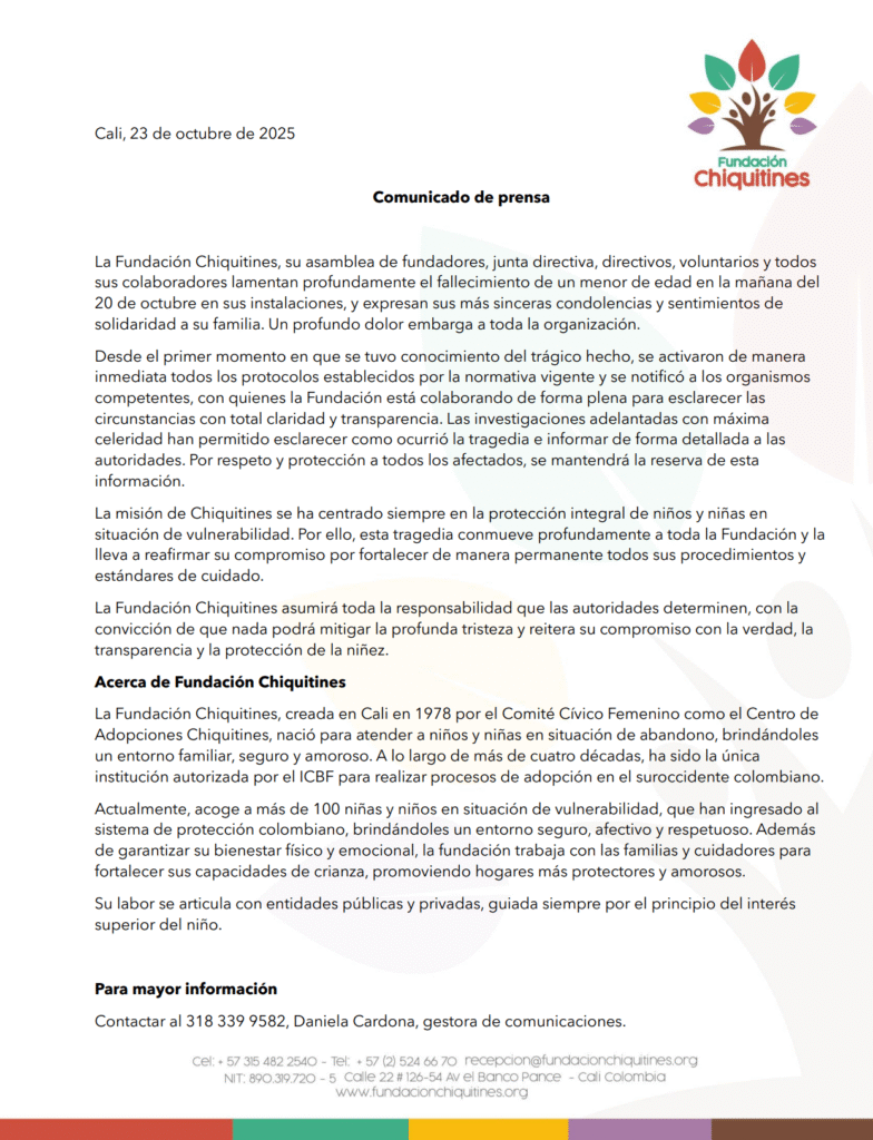 La Fundación Chiquitines reiteró que asumirá la responsabilidad que determinen las autoridades y que continuará colaborando con los entes de control para esclarecer los hechos.