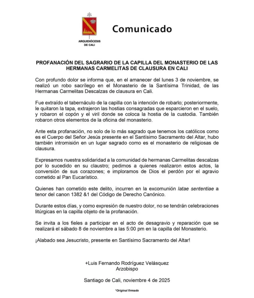 El arzobispo Luis Fernando Rodríguez Velásquez expresó su solidaridad con las religiosas y destacó la gravedad del acto. “Se trata de una profanación no solo del Santísimo Sacramento, sino de un espacio de clausura que representa siglos de oración y devoción”, indicó. Como consecuencia, la capilla afectada permanecerá sin celebraciones litúrgicas hasta que se realicen las reparaciones y actos de desagravio correspondientes.