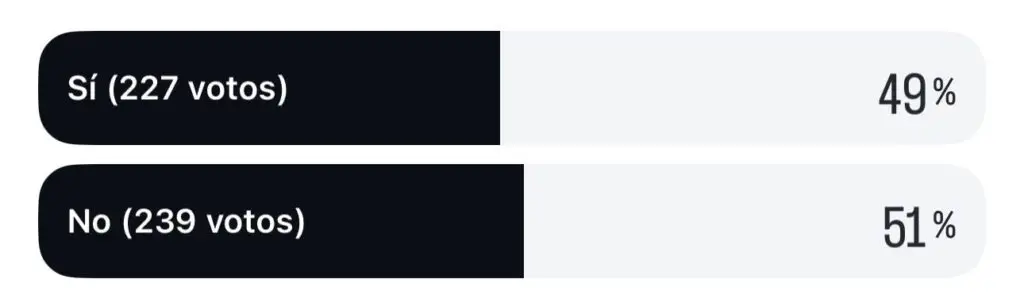 En Instagram, la participación fue equilibrada, 227 votos a favor y 239 en contra, lo que representa un 49% de aprobación frente a un 51% de rechazo. Los resultados muestran una ligera mayoría que prefiere que el evento no se traslade a la calle 25, aunque la diferencia no es significativa.
