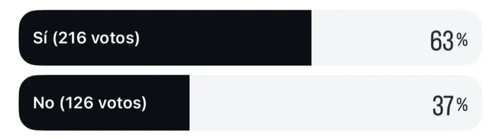 En Instagram, los resultados muestran un 63% de aprobación frente a un 37% de rechazo, con 216 votos a favor y 126 en contra. Los datos indican que la mayoría de los usuarios ve con buenos ojos la implementación del piloto, especialmente para reducir los congestionamientos que suelen extender los trayectos de 40 minutos hasta tres horas durante los lunes festivos.
