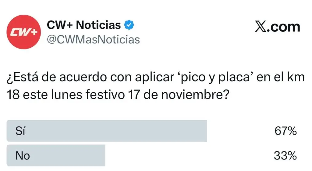 La pregunta que se realizó fue: “¿Está de acuerdo con aplicar ‘pico y placa’ en el km 18 este lunes festivo 17 de noviembre?”. Este cuestionamiento se replicó en las tres redes, mostrando diferencias entre usuarios según la plataforma.