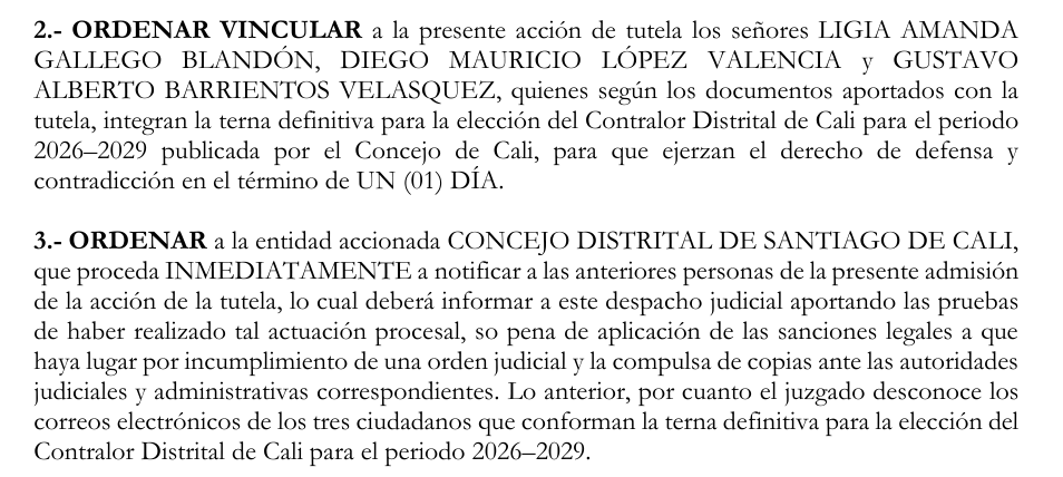 También vincula a la Alcaldía de Cali y a todas las personas que conforman la lista de admitidos e inadmitidos al proceso de elección. Lo hizo para que todas las personas interesadas o afectadas con un posible fallo de mérito pudieran intervenir y ejercer su derecho a la defensa y contradicción.
