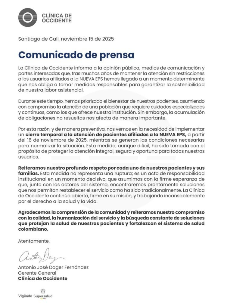 La Clínica de Occidente anunció que a partir del 16 de noviembre de 2025 suspenderá temporalmente la atención a pacientes afiliados a la Nueva EPS. La decisión se produce después de años de mantener el servicio sin restricciones, lo que generó acumulación de obligaciones no resueltas que afectan la operación diaria y la sostenibilidad de la institución. La medida busca proteger la calidad y seguridad de la atención.
