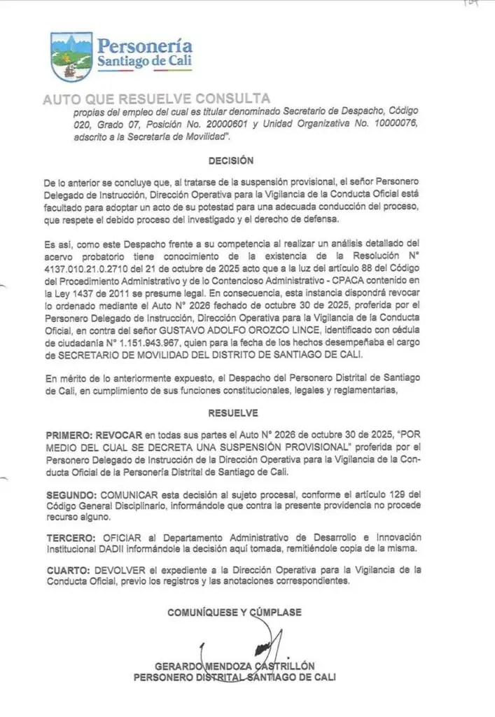El Personero Distrital de Santiago de Cali, Gerardo Mendoza Castrillón, fue quien firmó la resolución. El documento deja sin efecto el Auto N° 2026 de octubre 30 de 2025. Dicho documento había ordenado la suspensión provisional por tres meses, sin remuneración.