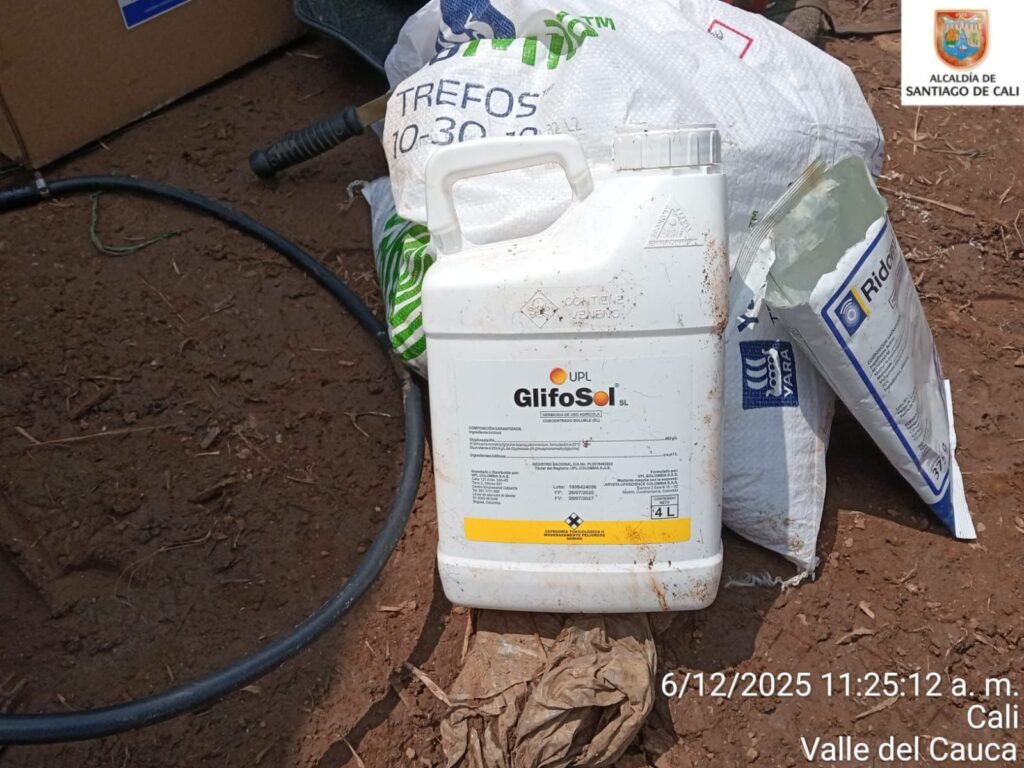 El predio ubicado en una zona de protección ambiental estaba siendo ocupado de manera ilegal, allí se hallaron galones de Glifosato utilizados para el cultivo y construcciones en ladrillo que no son permitidas dentro del Parque Nacional Natural Farallones.#AsíRecuperamosCali pic.twitter.com/488FDzpD3c