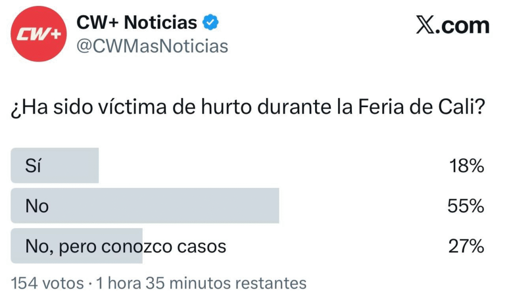 - En X.com: el 18 % de los participantes respondió afirmativamente haber sido víctima de hurto. Por su parte, un 55 % indicó que no ha sido robado, mientras que un 27 % manifestó que, aunque no ha sido víctima directa, conoce casos cercanos de inseguridad durante la feria.