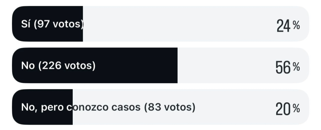 - En Instagram: la tendencia se mantuvo similar, con un 24 % (97 votos) que confirmó haber sido hurtado, un 56 % (226 votos) que no ha tenido incidentes, y un 20 % (83 votos) que reporta conocer casos de terceros.
