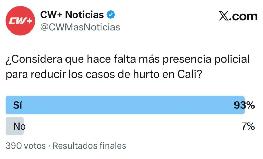En Instagram la pregunta realizada fue: “¿Considera que hace falta más presencia policial para reducir los casos de hurto en Cali?”, la respuesta fue un “Sí” casi rotundo. Un total de 582 personas votaron a favor de aumentar la vigilancia, lo que representa el 96% de la muestra. Por el contrario, apenas 25 usuarios, equivalente al 4%, consideraron que no es necesario incrementar el número de uniformados.