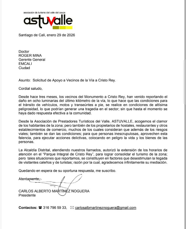 El sector turístico exige que Emcali presente un cronograma de trabajo detallado para la recuperación de este punto crítico. No basta con soluciones temporales, pues el cableado de la zona requiere un diagnóstico integral. Por otra parte, la comunidad del barrio San Cayetano y zonas aledañas se han unido al llamado para recuperar la tranquilidad. De este modo, se busca que el acceso al monumento vuelva a ser un lugar seguro para las familias. Finalmente, se espera que la gerencia de Energía responda formalmente a la petición radicada por los prestadores de servicios.