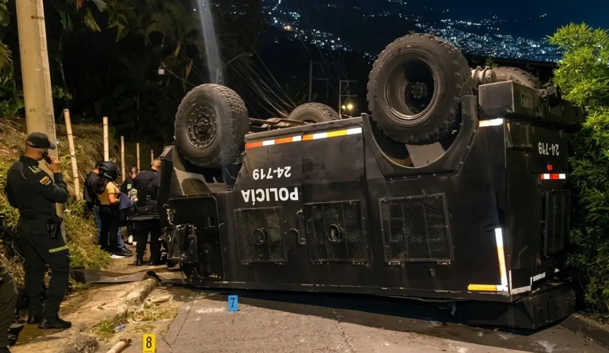 Un grave accidente de tránsito se registró en la noche de este miércoles en el sector de Alto Meléndez, en la ladera de Cali. Una tanqueta de la Unidad de Diálogo y Mantenimiento del Orden (UNDMO) descendió a alta velocidad por una pendiente tras sufrir una falla mecánica. El vehículo terminó volcado lateralmente sobre la vía pública, lo que generó pánico entre los residentes de la zona.