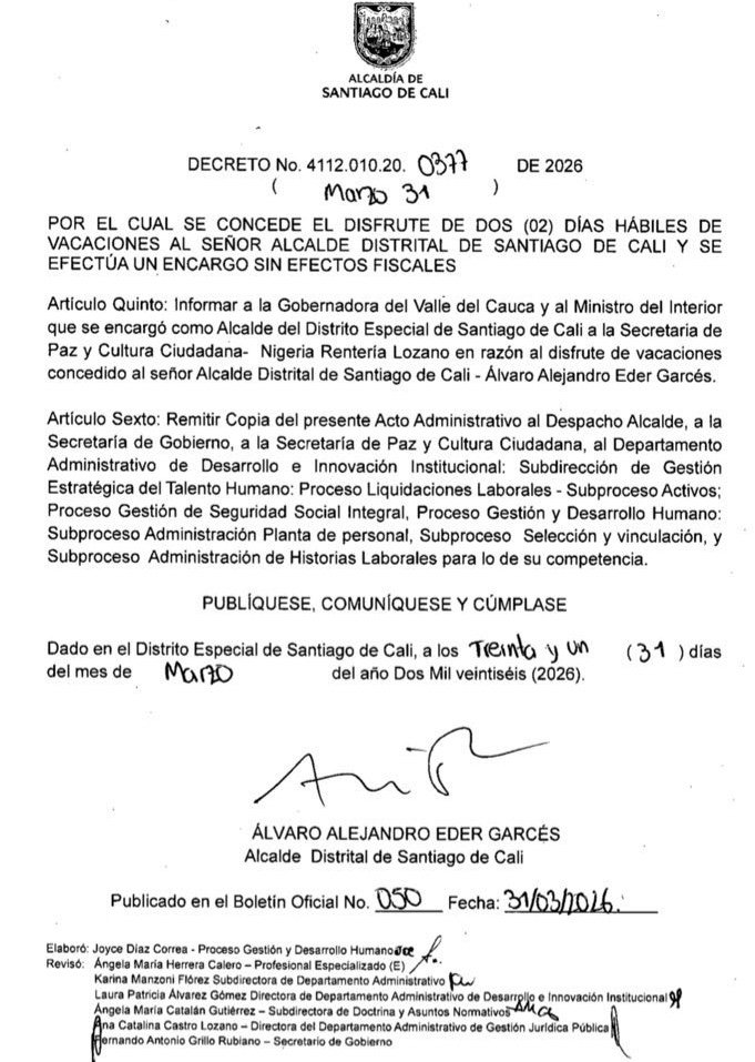 El alcalde de Cali, Alejandro Eder, se ausentará de su cargo durante los próximos días tras confirmarse el disfrute de un período de vacaciones. Según el decreto, el mandatario tomó dos días hábiles de descanso correspondientes a su periodo laboral de 2025. La medida establece que el tiempo de ausencia comprende desde el primero hasta el seis de abril. Se espera que el funcionario retome sus funciones habituales el martes siete de abril.