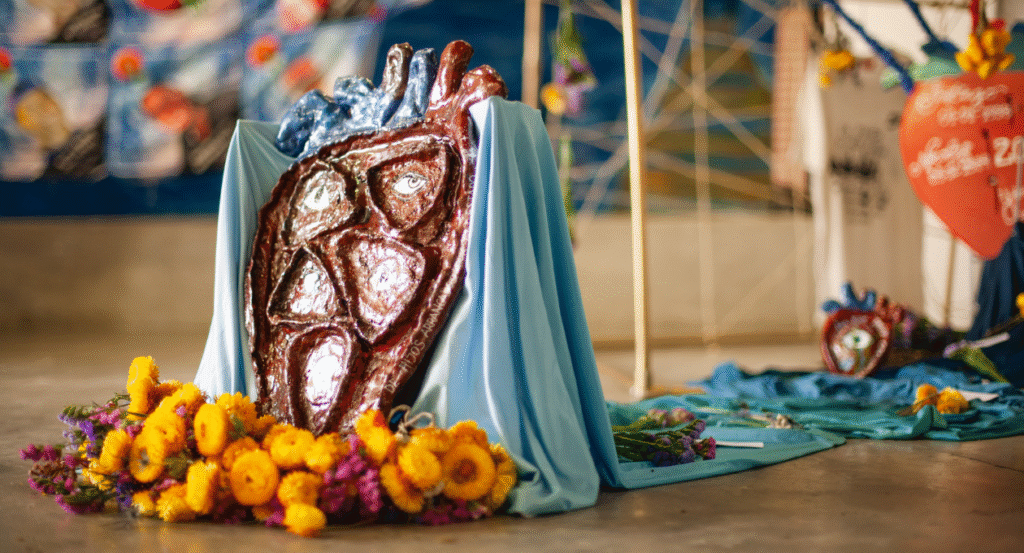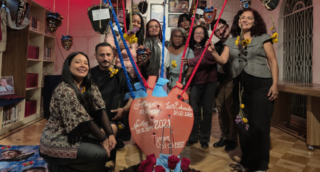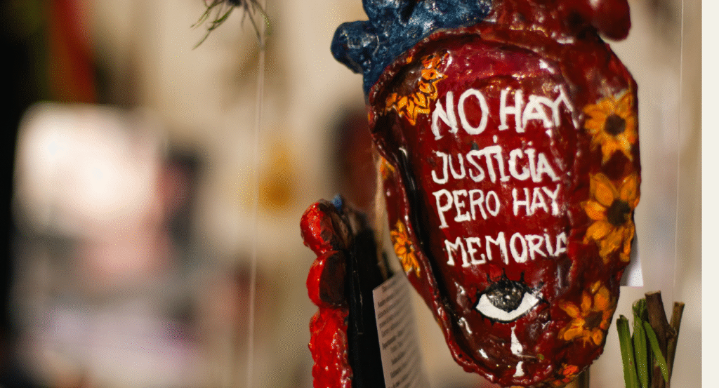 En honor a sus vidas y sus nombres, sus familiares decidieron organizarse y tras cinco años exigiendo justicia, transformaron su dolor en arte como una dosis para la memoria. La galería está representada simbólicamente por corazones que llevan mensajes conmemorativos y de lucha. Esos corazones además tienen ojos, dibujos y nombres de las víctimas mortales. ‘Paz con justicia’, ‘Memoria’, ‘Educación, no persecución’ y ‘la tierra no se venden’ se lee.