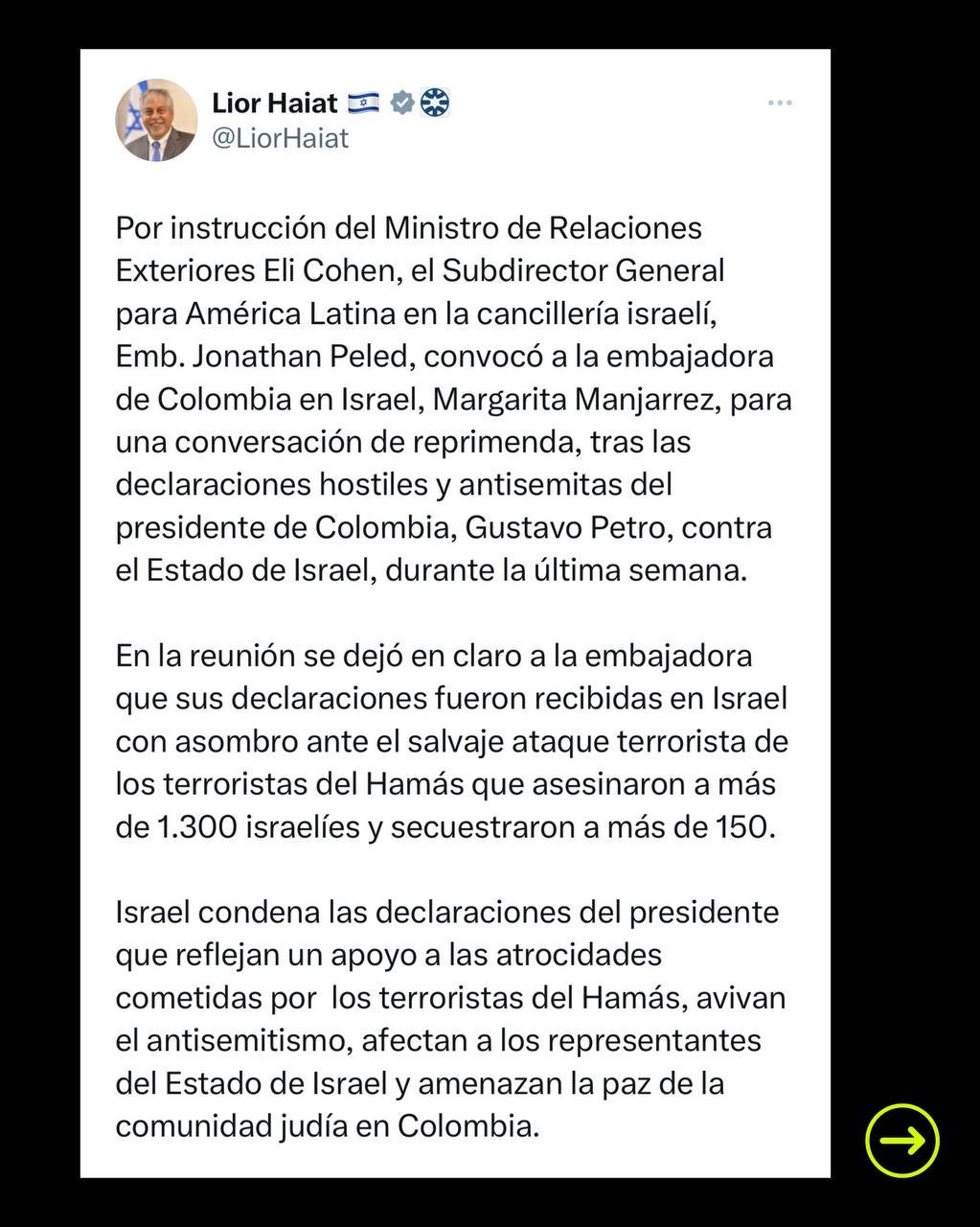 Tras las recientes declaraciones del Embajador de Israel en Colombia, Gali Dagan, y el Ministerio de Asuntos Exteriores de Israel, en las que condenaron las expresiones del presidente colombiano Gustavo Petro, el mandatario colombiano respondió a través de sus redes sociales con una posición firme.