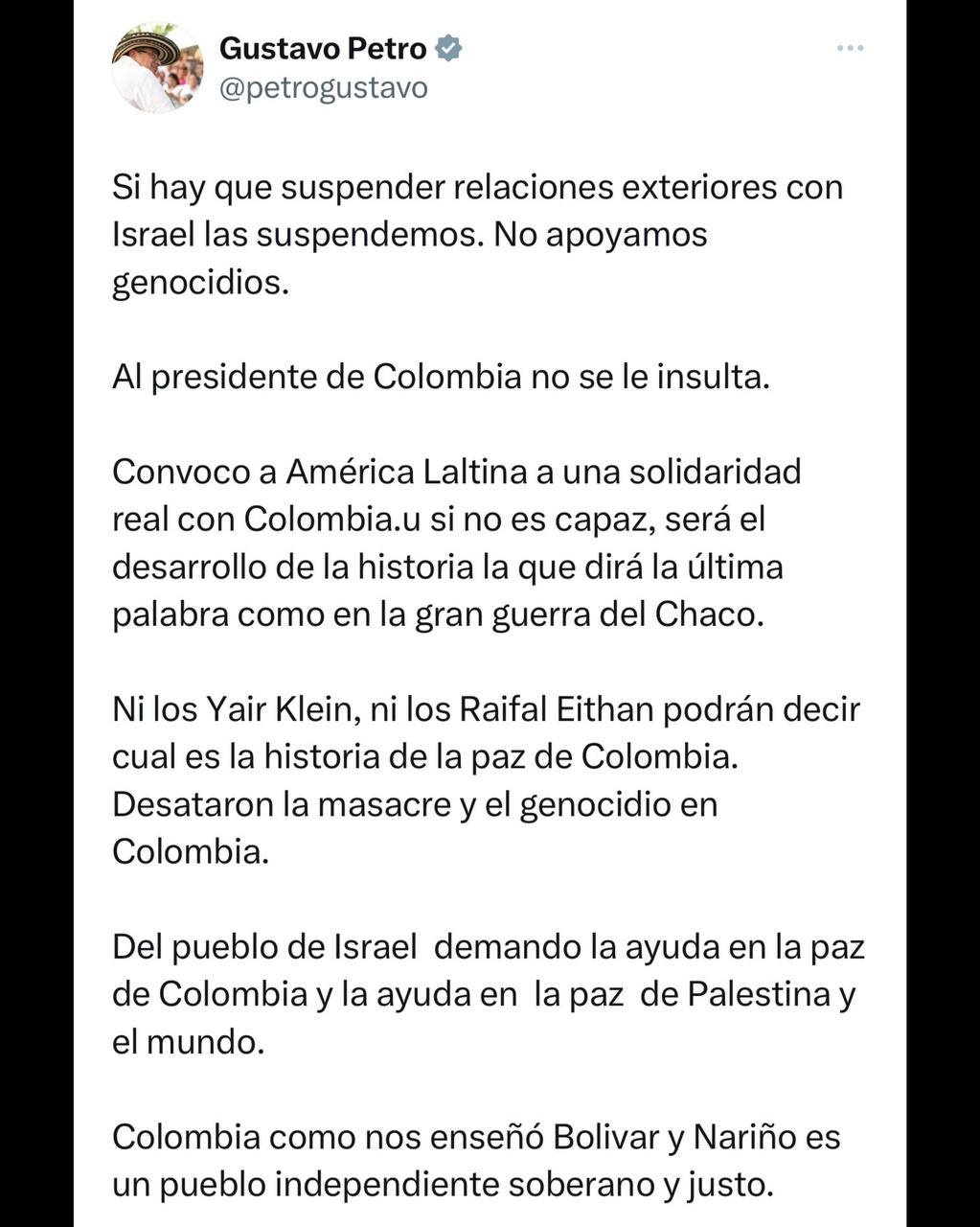 Petro escribió en su cuenta de una red social: “Si hay que suspender relaciones exteriores con Israel las suspendemos. No apoyamos genocidios”. La respuesta del presidente se dio en el contexto de las tensiones que han surgido en relación con el conflicto en Oriente Medio.