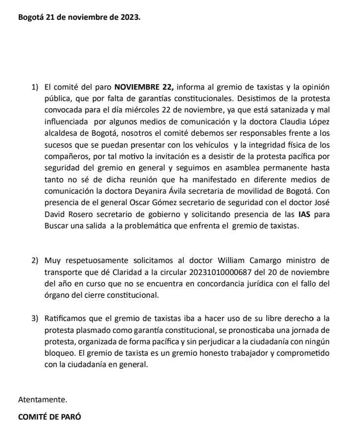 El paro de taxistas programado para mañana 22 de noviembre y anunciado por Hugo Ospina, íder de los taxistas, ya no es respaldado por el comité del paro.