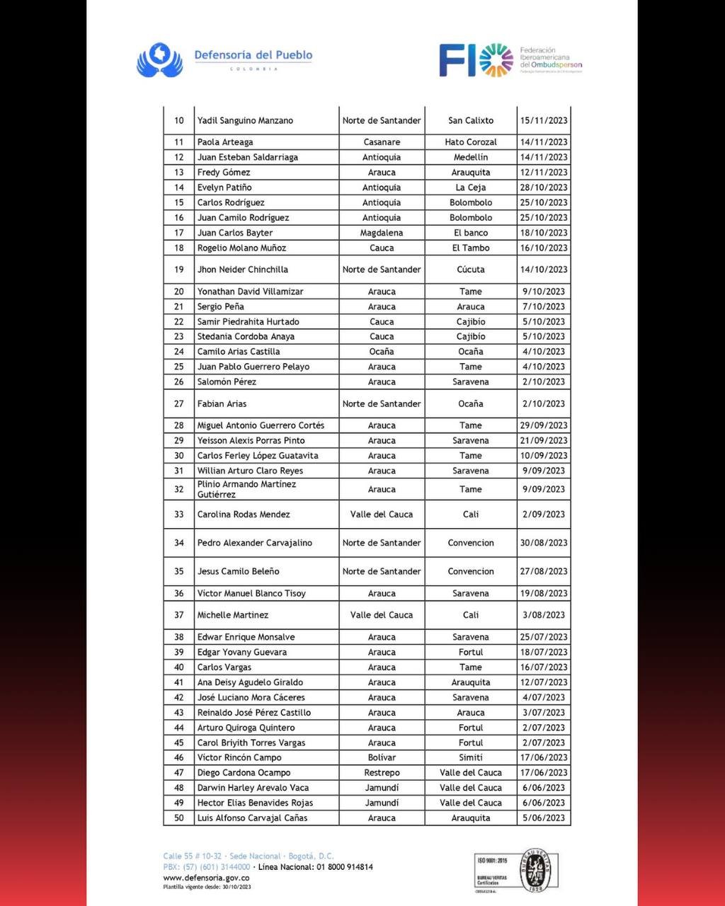 El Defensor del Pueblo le pide a estos grupos que confirmen información sobre estas personas privadas de la libertad para llegar a un acuerdo e iniciar su proceso de liberación.