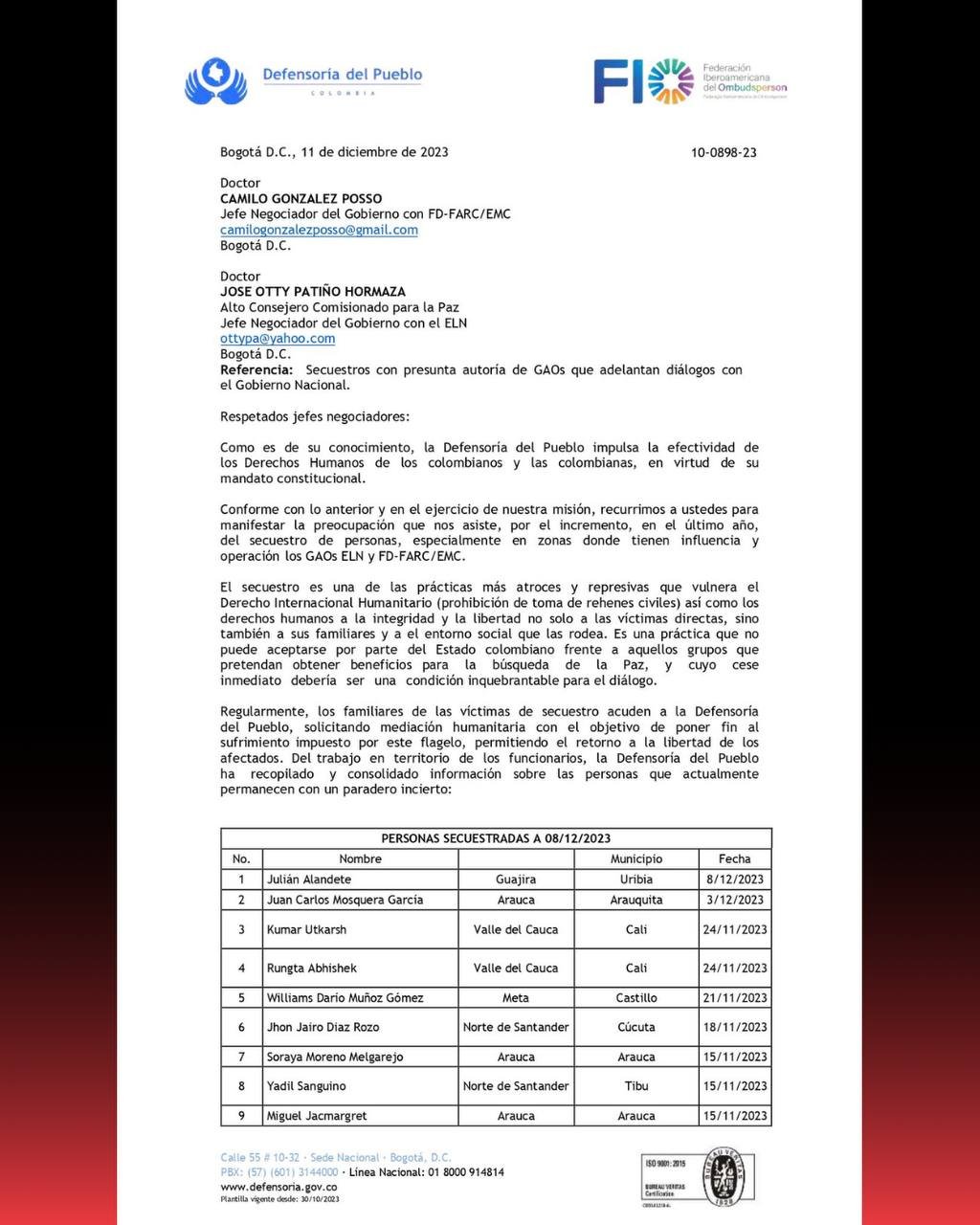 . “Debido a la preocupación que nos asiste por el incremento del secuestro de personas, hemos solicitado a estos grupos armados ilegales la confirmación de datos sobre las personas que tienen en su poder”,