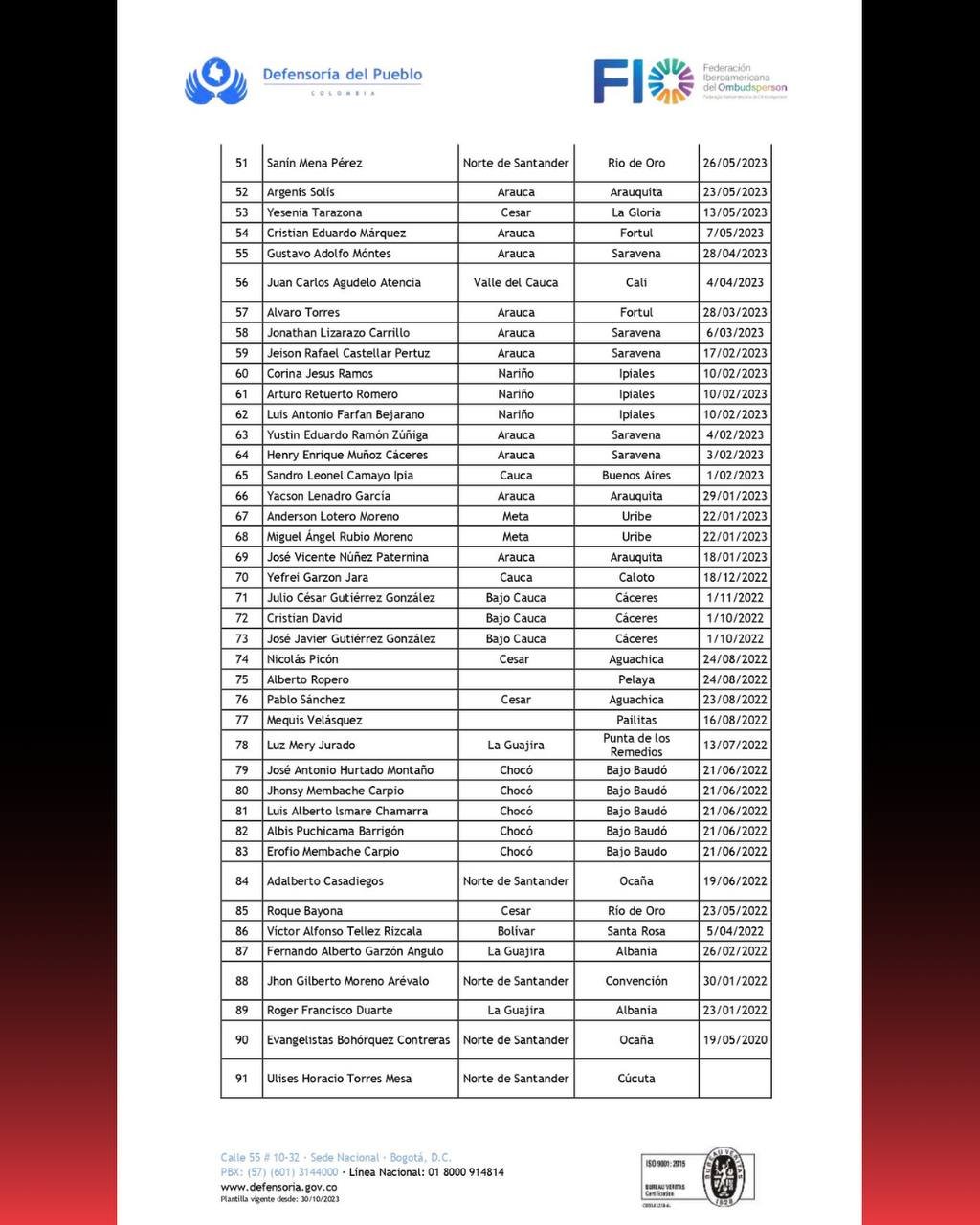 Por otra parte, Camargo afirma que esta lista puede ser mayor, ya que algunos familiares de las víctimas no denuncian por temor a las represalias que puedan tomar los grupos armados contra ellos.