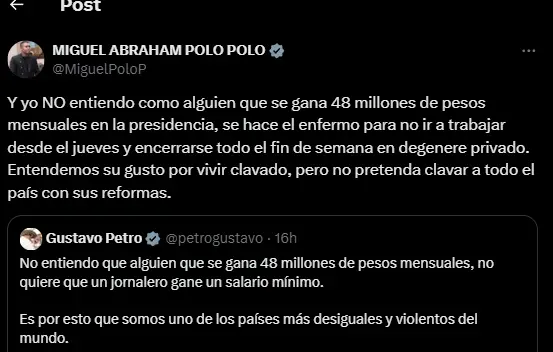 Sin embargo, uno de los aludidos en el video, el congresista Miguel Polo Polo, no tardó en responder. A través de sus redes sociales, Polo Polo aprovechó para hacer una crítica directa al mandatario. Pues mencionó su ausencia en los últimos días debido a problemas de salud, en particular durante su visita a la región del Cauca. En su respuesta, Polo Polo fue contundente: “Y yo NO entiendo cómo alguien que se gana 48 millones de pesos mensuales en la presidencia se hace el enfermo para no ir a trabajar desde el jueves y encerrarse todo el fin de semana en degenere privado”. En tono irónico, añadió: “Entendemos su gusto por vivir clavado, pero no pretenda clavar a todo el país con sus reformas”.