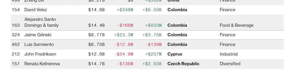 Jaime Gilinski, con 8.770 millones de dólares en su haber, se ubica en la tercera posición entre los millonarios colombianos, habiendo escalado gracias a un crecimiento de 3.750 millones en su fortuna en el transcurso del año. Este avance lo coloca en el puesto 324 en el ámbito internacional.