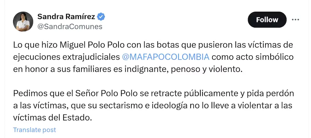El rechazo al comportamiento del congresista no se limitó a las madres de las víctimas. La senadora del Partido Comunes, entre otros líderes políticos, también condenó sus declaraciones, calificándolas como un ataque a la memoria histórica de Colombia. En su cuenta de X, Sandra Ramírez indicó que las acciones de Polo Polo eran “indignantes” y pidió una retractación pública.