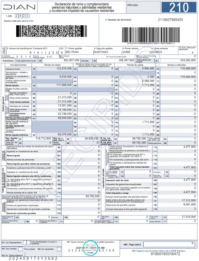 El barranquillero recibió ingresos por 28.165 millones de pesos durante el año de la declaración, estos provenientes de “otros ingresos y rentas”, de las cuales 27.894 millones son reportados como “ganancias ocasionales en el país y del exterior”.