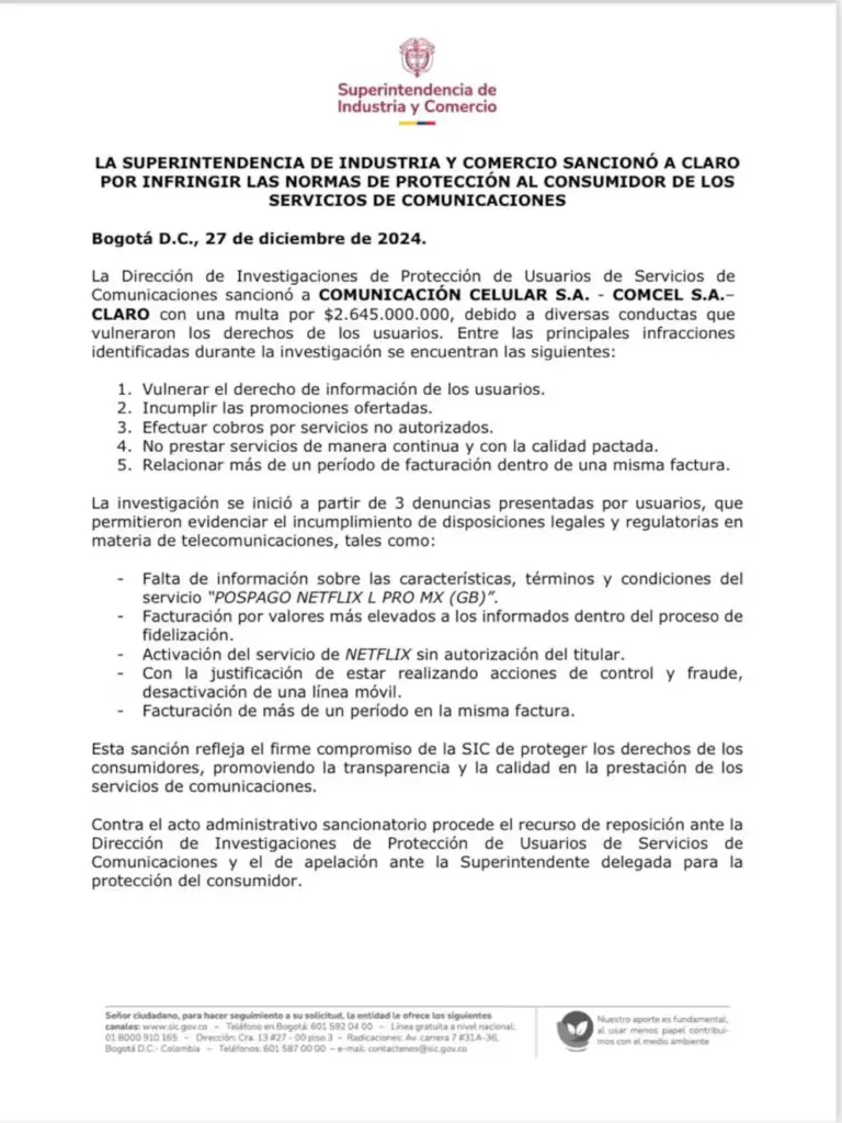 La Superintendencia de Industria y Comercio (SIC) ha impuesto una millonaria multa de $2.645 millones a Claro Colombia por infringir las normas de protección al consumidor en el sector de telecomunicaciones. La sanción se origina a raíz de diversas denuncias presentadas por usuarios que evidenciaron una serie de conductas irregulares por parte de la compañía.
