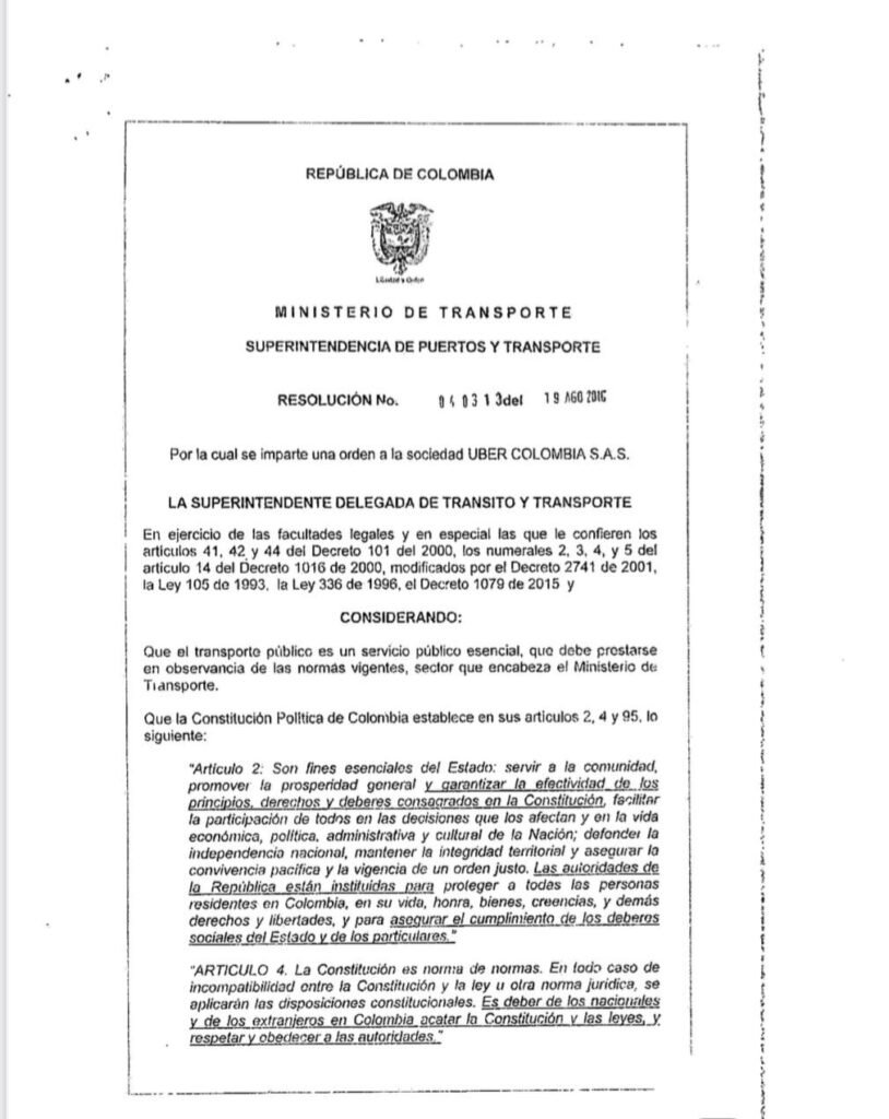 En las últimas horas Hugo Ospina, líder gremial de los taxistas, anunció que busca interponer una denuncia en contra de la Superintendencia de Transporte por incumplir en la ejecución de la Resolución 040313 de 2016, en la cual se impone una orden de cese de operaciones a UBER Colombia S.A.S.