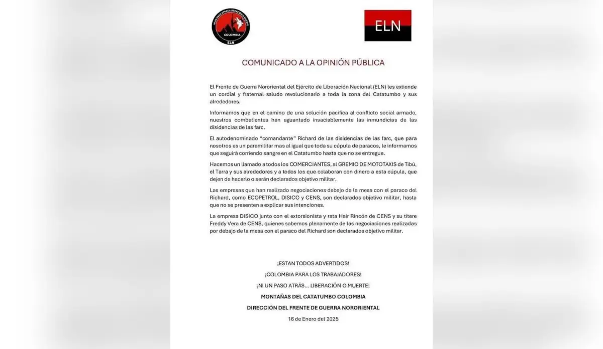 La situación en estas zonas de Colombia se ha vuelto más tensa y preocupante. Este jueves 16 de enero de 2025, se ha estado difundiendo un comunicado presuntamente emitido por el Frente de Guerra Oriental. En este comunicado se realizan fuertes acusaciones contra Richard Suárez. Conocido como alias “Richard”, señalándolo de ser un paramilitar.