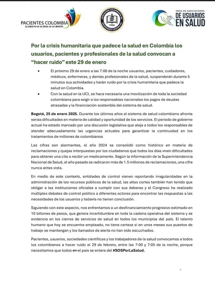 Por medio de un comunicado difundido en todas las redes sociales, organizaciones usuarios y profesionales de la salud han citado a un cese de actividades de cinco minutos el próximo miércoles 29 de enero, a las 7:00 p.m., a manera de protesta por la grave crisis que está atravesando el sistema de salud en Colombia.