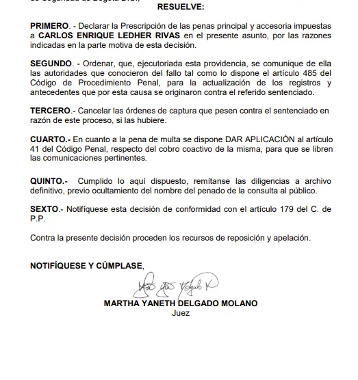 En el documento compartido a los medios de comunicación, se puede leer: “Visto el informe de captura que antecede y teniendo en cuenta que en auto de la fecha se decretó la prescripción de la pena impuesta al sentenciado Carlos Enrique Lehder Rivas, no se legaliza su captura y se dispone emitir boleta de libertad ante la Dirección de Investigación Criminal de la Policía Nacional e Interpol“.