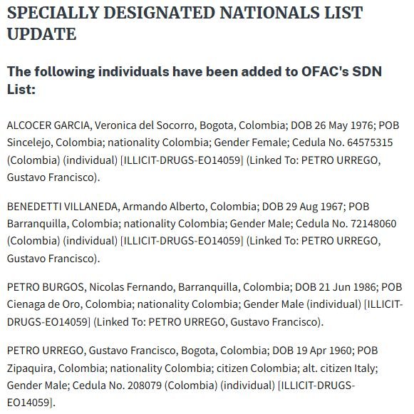 Tras la reciente crisis diplomática entre Estados Unidos y Colombia, el Departamento del Tesoro de EE. UU. confirmó que el presidente Gustavo Petro fue incluido en la Lista Clinton.