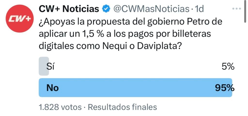 La encuesta se realizó de manera independiente en varias plataformas, con la misma pregunta adaptada para cada red social: “¿Apoyas la propuesta del gobierno Petro de aplicar un 1.5% a los pagos por billeteras digitales como Nequi o Daviplata?” Los resultados y las opiniones recogidas muestran tendencias claras sobre cómo los colombianos perciben la medida.