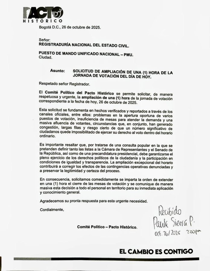 En una carta dirigida al registrador Hernán Penagos, el Pacto Histórico le solicitó al registrador Hernán Penagos ampliar la jornada electoral una hora. Es decir, hasta las 5 de la tarde. “Esta solicitud se fundamenta en hechos verificados y reportados a través de los canales oficiales”, dice. La colectividad argumentó los problemas en las mesas de votación.