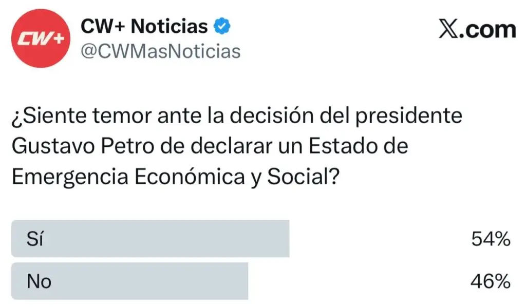 La decisión del presidente Gustavo Petro de declarar un Estado de Emergencia Económica y Social generó debate en redes sociales. Usuarios de Instagram, X y Facebook participaron en un sondeo digital de CW+ Noticias para conocer su percepción.