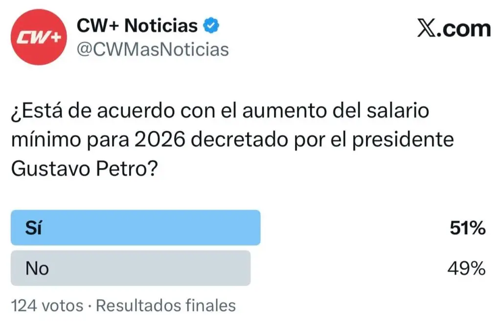 En la red social X, el sondeo digital fue publicado en la cuenta oficial de CW+ Noticias con la siguiente pregunta: ¿Está de acuerdo con el aumento del salario mínimo para 2026 decretado por el presidente Gustavo Petro?