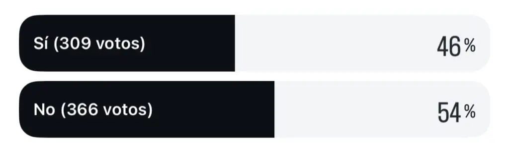 En esta red social, 366 usuarios votaron por el “No”, mientras que 309 personas marcaron el “Sí”, lo que evidencia una mayor inclinación hacia el desacuerdo con la medida. Aunque la diferencia no es abrumadora, sí marca una percepción más crítica entre los participantes de esta plataforma.