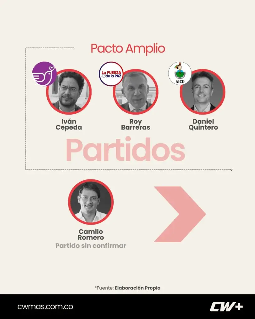 Los actuales candidatos son: Iván Cepeda (partido Pacto Histórico), Roy Barreras (partido La Fuerza de la Paz), Camilo Romero (sin confirmar) y Daniel Quintero (partido AICO), quien llegó luego de haberse bajado de la consulta interna del Pacto Histórico del pasado 26 de octubre y buscar el aval del partido indígena.